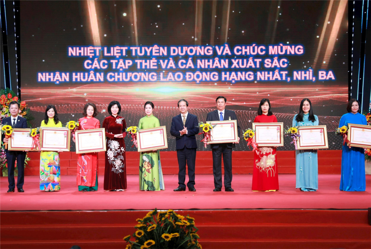 Bộ trưởng Bộ Giáo dục và Đào tạo Nguyễn Kim Sơn, Phó Chủ tịch Thường trực HĐND thành phố Phùng Thị Hồng Hà trao Huân chương Lao động hạng Nhất, Nhì, Ba tặng các tập thể, cá nhân có thành tích xuất sắc.