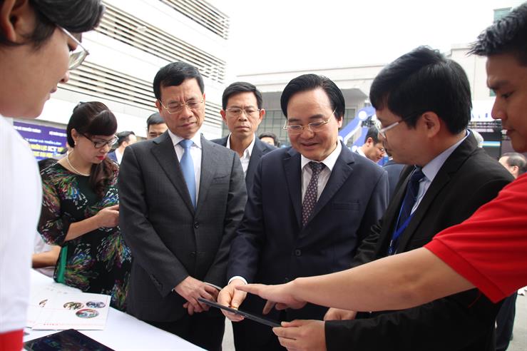 Bộ trưởng Bộ GD&ĐT Phùng Xuân Nhạ, Bộ trưởng Bộ TT&TT Nguyễn Mạnh Hùng tham quan gian hàng trưng bày sản phầm của doanh nghiệp trong khuôn khổ Tọa đàm