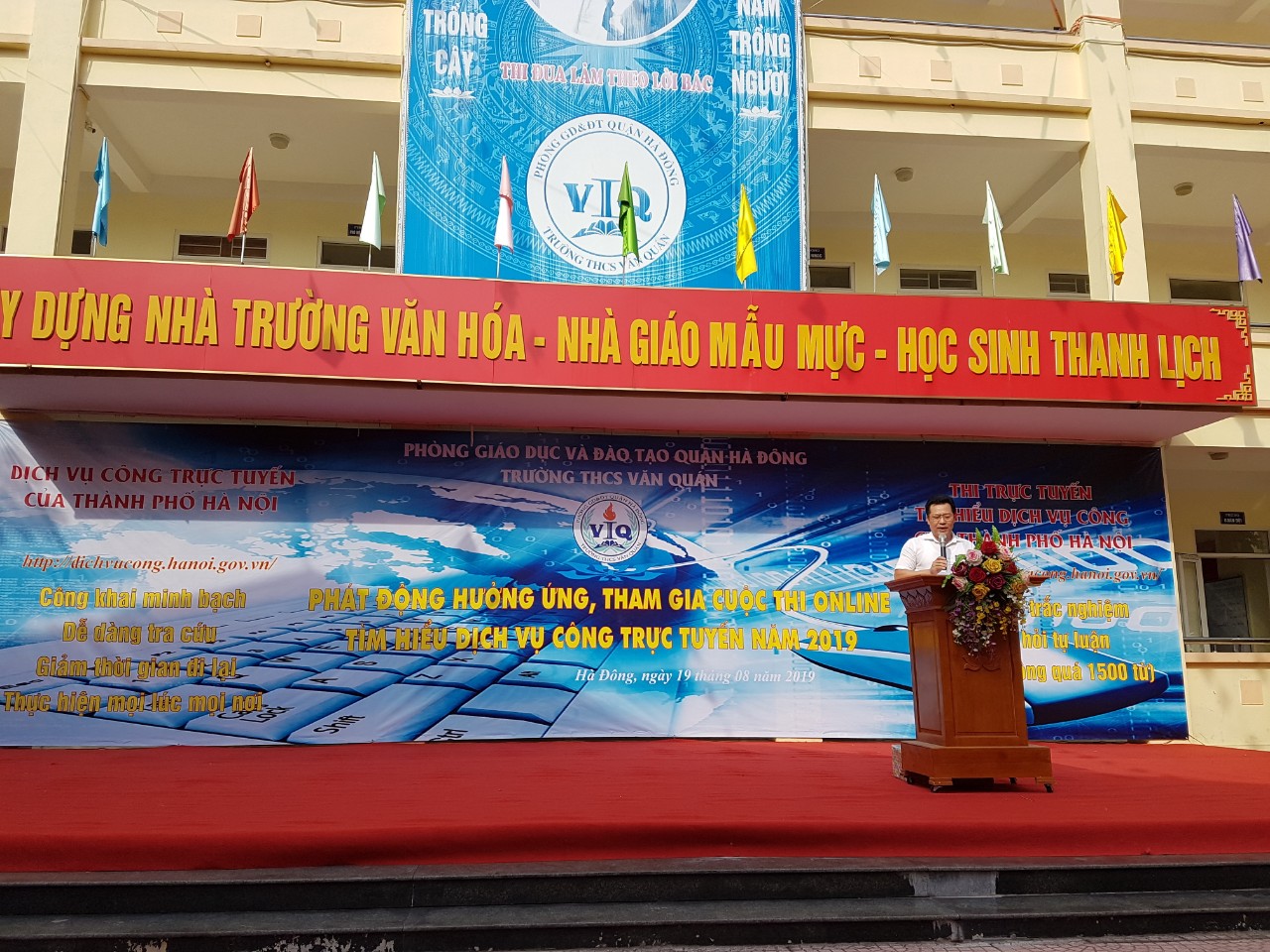 Thực hiện công văn hướng dẫn số 3281/SGDĐT ngày 31/7/2019 của Sở GD&ĐT Hà Nội và Công văn số 856/PGD&ĐT ngày 8/8/2019 của Quận Hà Đông về việc hướng dẫn triển khai cuộc thi online “Tìm hiểu dịch vụ công trực tuyến năm 2019”, sáng ngày 19/8/2019, tại trường THCS Văn Quán, Phòng GD&ĐT quận Hà Đông đã tổ chức phát động hưởng ứng tham gia cuộc thi Online “Tìm hiểu dịch vụ công trực tuyến năm 2019”. Đến dự buổi phát động có Ông Đàm Xuân Quang - Phó Chánh văn phòng Sở GD&ĐT Hà Nội; Ông Bạch Ngọc Lợi – Phó trưởng phòng GD&ĐT quận Hà Đông; Bà Quách Thị Lan Hương, Bà Tô Thị Kim Sa-Chuyên viên phòng GD&ĐT quận Hà Đông; Bà Nguyễn Thị Thanh – Phó phòng Tư pháp quận Hà Đông; Bà Vũ Thị Hà- Phó Chủ tịch phường Văn Quán; Ông Bùi Đức Minh – Chủ tịch Mặt trận Tổ quốc; đại diện Ban Giám hiệu, giáo viên Tổng phụ trách Đội và cán bộ giáo viên phụ trách công nghệ thông tin các trường MN, TH và THCS trên địa bàn quận về tham dự buổi phát động.