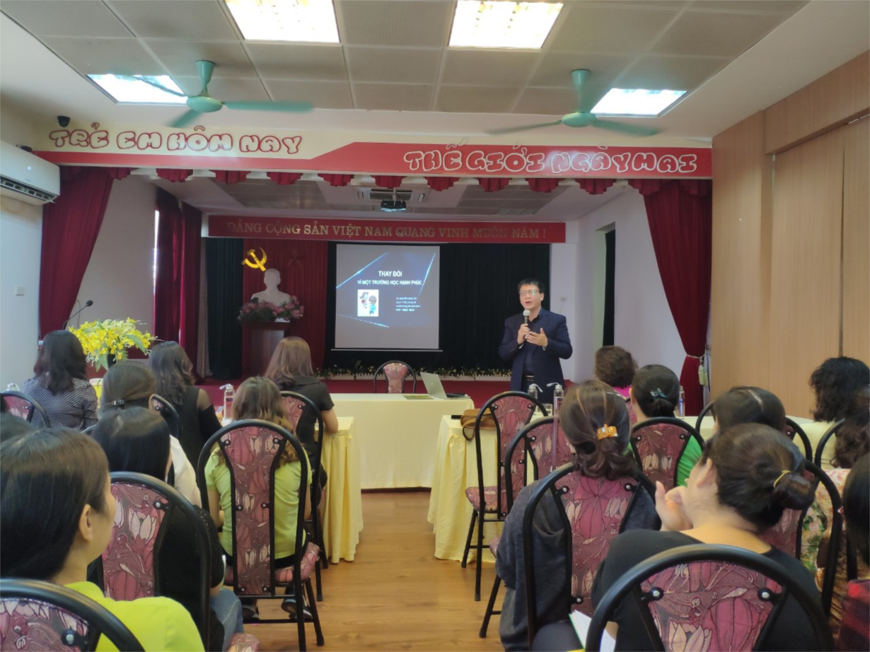 Phát biểu khai mạc lớp tập huấn, đồng chí Vương Hương Giang - Trưởng phòng Giáo dục và Đào tạo quận khẳng định tầm quan trọng của việc xây dựng Trường học hạnh phúc, đồng thời động viên các đồng chí cán bộ quản lý, giáo viên, nhân viên các trường hãy mạnh dạn thay đổi hướng tới trường học hạnh phúc. Đồng chí Trần Thị Thu Hà - Ủy viên Ban Thường vụ Công đoàn Giáo dục Việt Nam, Ủy viên Ban Thường vụ LĐLĐ Thành phố, Chủ tịch Công đoàn Ngành Giáo dục Hà Nội phát biểu định hướng triển khai phong trào xây dựng “Trường học hạnh phúc” trên địa bàn Thành phố Hà Nội, quán triệt mục tiêu của chuyên đề. Trong buổi tập huấn, Tiến sĩ Nguyễn Ngọc Ân - Phó chủ tịch Công đoàn Giáo dục Việt Nam đã trao đổi chia sẻ những kiến thức, kỹ năng, thái độ xây dựng trường học hạnh phúc. Trường học hạnh phúc là nơi cán bộ, giáo viên, nhân viên, học sinh nhà trường được YÊU THƯƠNG, được TÔN TRỌNG, được AN TOÀN, được HIỂU, được CÓ GIÁ TRỊ. Trường học hạnh phúc đề cao cảm xúc tích cực của mỗi cá nhân trong nhà trường, các mối quan hệ tốt đẹp, ứng xử công bằng, tôn trọng lẫn nhau, đồng cảm yêu thương và sẻ chia. Bên cạnh phương pháp giảng dạy lôi cuốn, học sinh được tự do sáng tạo, có môi trường gắn kết; cán bộ, giáo viên, nhân viên và học sinh có cơ hội thể hiện, khẳng định và được công nhận giá trị của bản thân. Chính các nhà trường là nơi tạo ra sự hạnh phúc cho người dạy và người học.