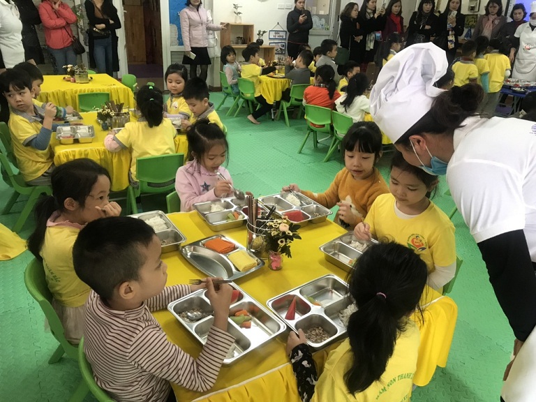 Đoàn dự hoạt động thể dục sáng và quy chế tổ chức giờ ăn tại các lớp. Trong đó, lớp mẫu giáo Lớn số 3, lớp mẫu giáo Lớn số 1 triển khai tổ chức thực giờ ăn của trẻ theo hình thức “Bữa ăn gia đình, bé tự phục vụ” và “ ăn bằng khay theo xuất ăn". Với việc đổi mới hình thức tổ chức bữa ăn giúp cho trẻ có kỹ năng tự phục vụ, kỹ năng sử dụng thìa, đũa, dĩa phù hợp khi ăn, biết quan tâm, nhường nhịn nhau, biết tự lấy thức ăn vừa đủ. Rèn cho trẻ có nề nếp, thói quen, kỹ năng, hành vi văn minh trong giao tiếp khi ăn cùng các bạn, tạo không khí ấm cúng vui vẻ như một bữa ăn ở gia đình, giúp trẻ ăn ngon miệng hơn.