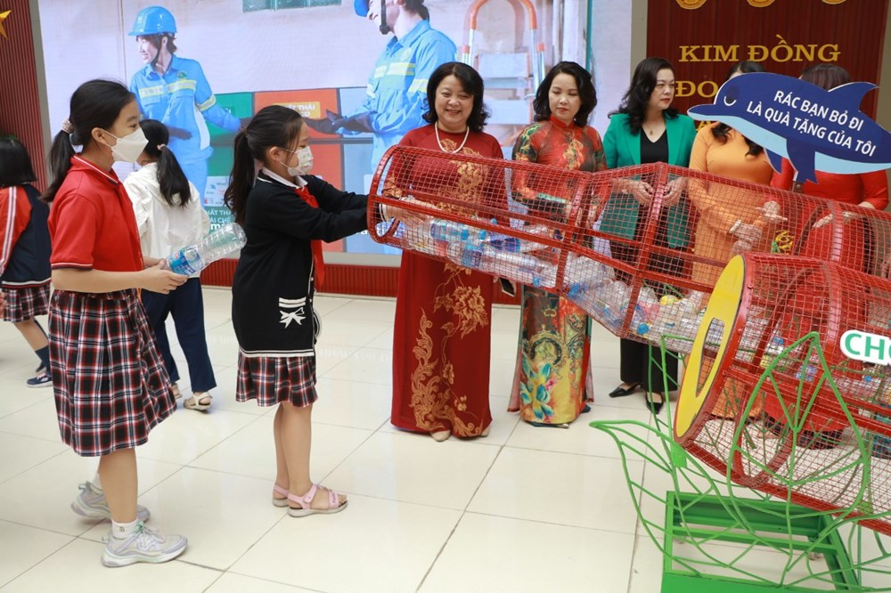 Các em học sinh trường Tiểu học Kim Đồng (quận Ba Đình) cùng các đại biểu tham gia hoạt động thu gom, tập hợp rác thải nhựa.