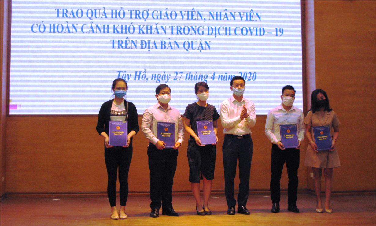 Phó Chủ tịch UBND quận Tây Hồ Phạm Xuân Tài, cho biết: Thời gian vừa qua, Ban Chỉ đạo phòng, chống dịch quận Tây Hồ đã nhận được sự quan tâm, ủng hộ của nhiều nhà hảo tâm là các cá nhân, tổ chức cho công tác phòng, chống dịch Covid-19 với tổng số gần 2 tỷ đồng và nhiều nhu yếu phẩm. Ban Chỉ đạo phòng, chống dịch Covid-19 quận Tây Hồ đã hỗ trợ cho các lực lượng tuyến đầu trong công tác phòng, chống dịch Covid-19 gồm nhân viên y tế, công an, quân đội; ngoài ra, Ban Chỉ đạo cũng đã quan tâm hỗ trợ các gia đình người có công, gia đình có hoàn cảnh khó khăn do ảnh hưởng của dịch Covid-19 trên địa bàn bằng nhiều hình thức. Để kịp thời động viên, hỗ trợ đội ngũ giáo viên, nhân viên của các trường học trên địa bàn quận đang gặp nhiều khó khăn vì ảnh hưởng của dịch Covid-19, Ban Chỉ đạo phòng, chống dịch quận Tây Hồ đã tổ chức rà soát và quyết định trao quà hỗ trợ cho 150 giáo viên, nhân viên. Toàn bộ các phần quà đều được huy động từ nguồn xã hội hoá, do một số đơn vị, trường học và cá nhân trên địa bàn ủng hộ.
