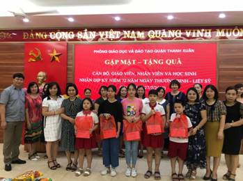Sáng ngày 25/7/2019, phòng Giáo dục và Đào tạo quận Thanh Xuân tổ chức gặp mặt, thăm hỏi động viên và tặng quà cán bộ, giáo viên, nhân viên là thương bệnh binh, con liệt sỹ; học sinh là con liệt sĩ đang công tác và học tập tại các trường Mầm non, Tiểu học, THCS trên địa bàn quận nhân dịp kỉ niệm 72 năm ngày Thương binh-Liệt sĩ (27/7/1947-27/7/2019).