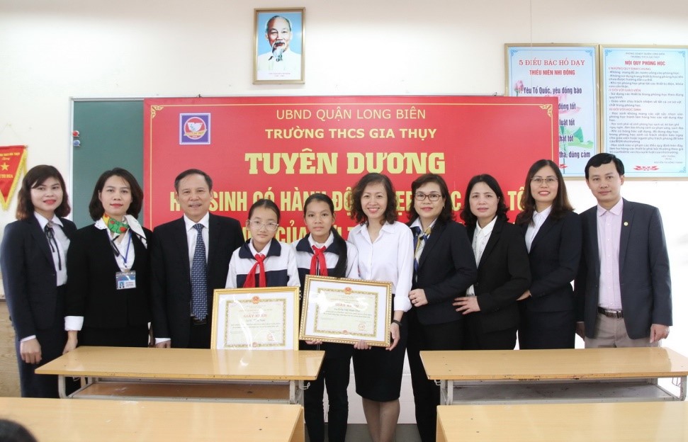 Kịp thời ghi nhận hành động đẹp, nhặt được của rơi trả lại người đánh mất của hai em Đỗ Hồng Ngọc và Trần Thị Minh Thư, học sinh lớp 6A3, Trường THCS Gia Thụy, (quận Long Biên, Hà Nội), ngày 13/12/2019, Giám đốc Sở Giáo dục và Đào tạo Hà Nội đã ký Quyết định số 2177/QĐ-SGDĐT, tặng giấy khen, biểu dương hành động đẹp, việc làm tốt cho các em.