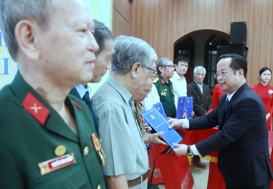 Giám đốc Sở GD&ĐT Hà Nội Trần Thế Cương tặng quà tri ân các nhà giáo đã tham gia kháng chiến.