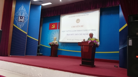 Thực hiện Kế hoạch liên tịch số 06/KHLT-SGD&ĐT-CĐN ngày 02/10/2015 về việc phối hợp công tác giữa Ban Giám đốc Sở GD&ĐT và Ban Thường vụ Công đoàn ngành Giáo dục Hà Nội, kế hoạch công tác đào tạo, bồi dưỡng năm 2016; ngày 28/4/2016 Sở GD&ĐT và Công đoàn ngành Giáo dục Hà Nội tổ chức Hội nghị “Học tập và làm theo tấm gương đạo đức Hồ Chí Minh” cho đội ngũ cán bộ quản lý, chủ tịch công đoàn các đơn vị trực thuộc Sở Giáo dục và Đào tạo Hà Nội. Tới dự có đồng chí Trần Thị Thu Hà - UVTV CĐGD Việt Nam, UVTV LĐLĐ Thành phố, Chủ tịch Công đoàn ngành Giáo dục Hà Nội, các đồng chí lãnh đạo Phòng, Ban Sở GD&ĐT Hà Nội và các đồng chí Bí thư, Hiệu trưởng, Chủ tịch công đoàn đơn vị trực thuộc.