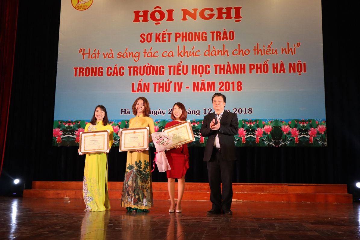 Thứ trưởng Bộ GD&ĐT Nguyễn Hữu Độ trao Giấy khen của Sở GD&ĐT Hà Nội cho các tác giả có ca khúc đoạt giải A