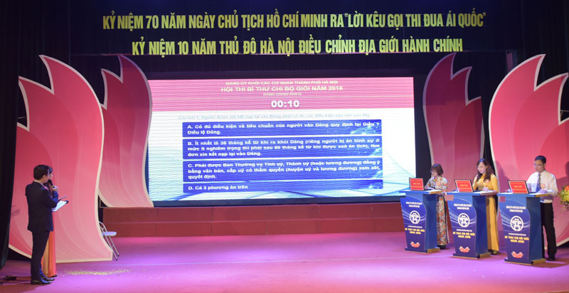 Trưởng Ban Tuyên giáo Thành ủy Nguyễn Văn Phong và Bí thư Đảng ủy Khối các cơ quan TP Lê Thị Thu Hằng đã trao hoa, lưu niệm và chúc mừng 9 thí sinh. Các thí sinh trải qua 3 phần thi sôi nổi gồm: Thi tự giới thiệu bản thân và chi bộ, thi thuyết trình kỹ năng điều hành buổi sinh hoạt chuyên đề, thi kiến thức chung.