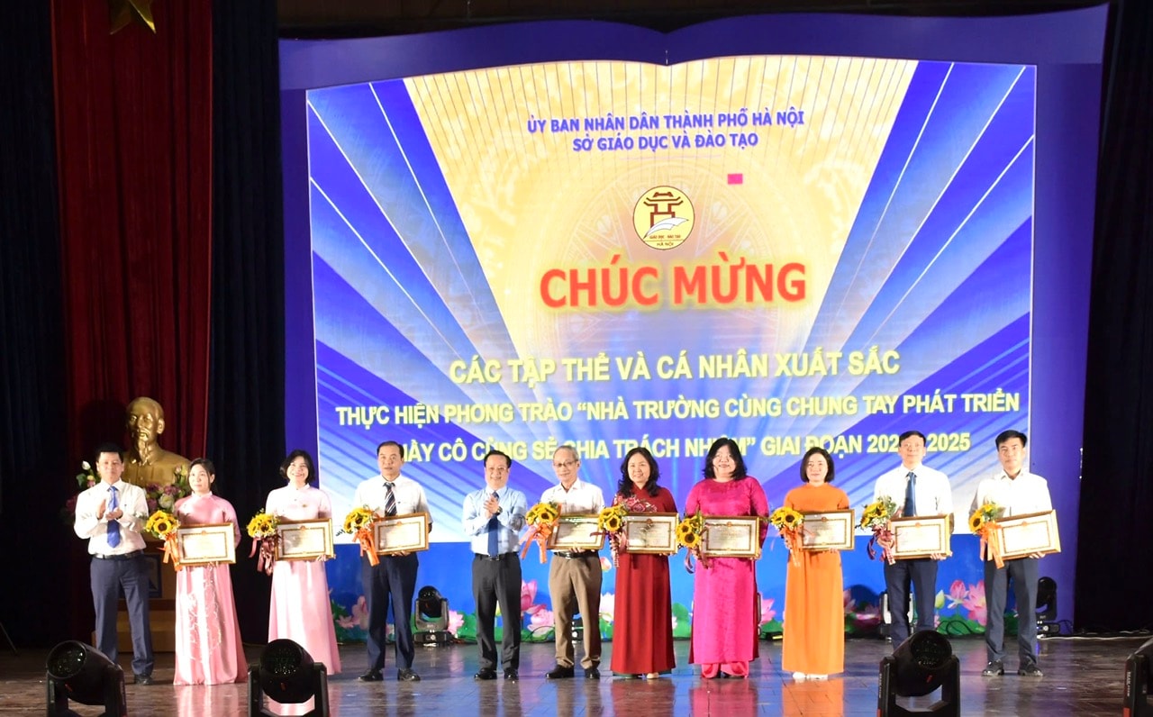 Lãnh đạo Sở GD-ĐT Hà Nội khen thưởng các tập thể, cá nhân. Ảnh: Lê NguyễnBa năm triển khai cho thấy, phong trào không chỉ giúp kết nối giữa ngành Giáo dục các quận, huyện, thị xã và các nhà trường, mà còn là giải pháp mới nêu cao tinh thần trách nhiệm của mỗi nhà giáo, từng trường học cùng thực hiện mục tiêu nâng cao hơn nữa chất lượng giáo dục đào tạo Thủ đô.