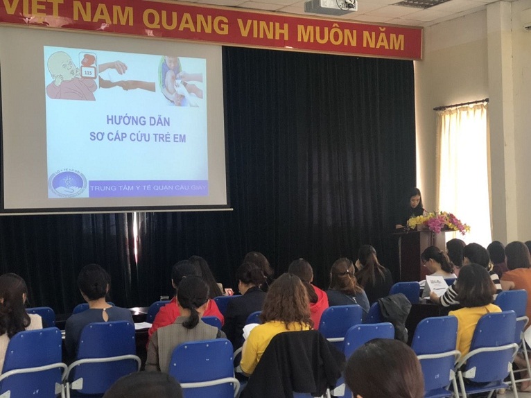 Buổi tập huấn được diễn ra qua 2 phần. Phần lý thuyết do giảng viên: Thạc sĩ, bác sĩ Nguyễn Hải Yến Phó Giám đốc Trung tâm y tế Quận Cầu Giấy chia sẻ. Phần thực hành: Chia thành các nhóm thực hiện các kỹ thuật sơ cấp cứu do bác sĩ Hải Yến và các cán bộ y tế Quận Cầu Giấy hướng dẫn cho 100% học viên được thực hành các loại sơ cấp cứu.