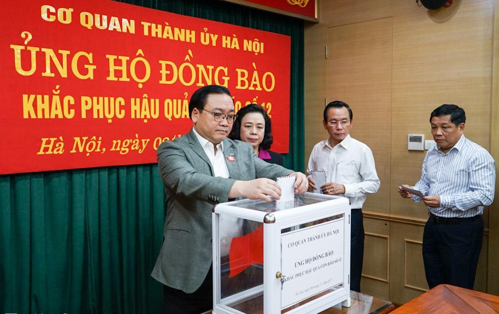 Để tiếp tục hưởng ứng lời kêu gọi ngày 6/11/2017 của Đoàn chủ tịch UBTW MTTQ Việt Nam về vận động quyên góp ủng hộ đồng bào khắc phục thiệt hại do bão lũ gây ra, Thành ủy – HĐND – UBND – UB MTTQ Việt Nam thành phố Hà Nội phát động quyên góp ủng hộ nhân dân các tỉnh bị thiệt hại, kêu gọi các cơ quan, tổ chức, đơn vị, doanh nghiệp và các nhà hảo tâm và nhân dân trên địa bàn Thủ đô phát huy truyền thống đoàn kết, “Tương thân tương ái”, “Lá lành đùm lá rách” bớt một phần thu nhập tham gia giúp đỡ đồng bào Nam, Trung bộ bị ảnh hưởng do bão số 12 gây ra. Vận động mỗi cán bộ công nhân viên chức ủng hộ ít nhất 1 ngày lương.