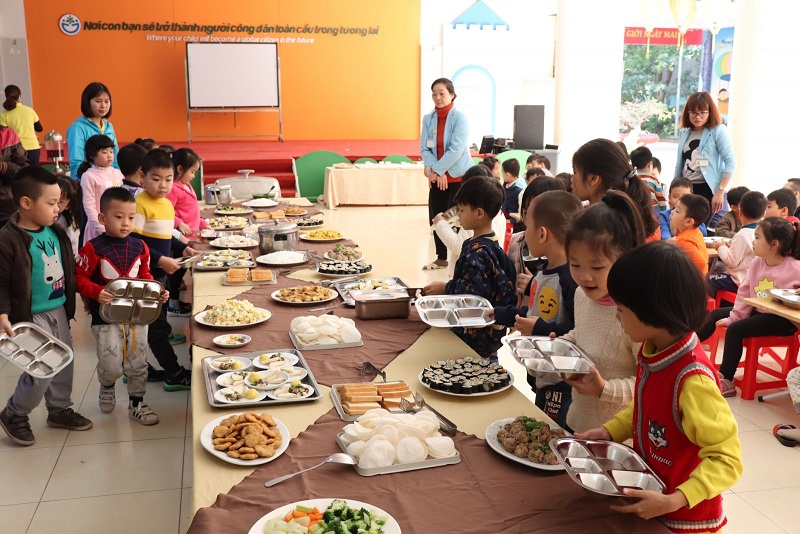 Trước mỗi bữa tiệc Buffet, nhà trường lên danh sách và lựa chọn món ăn với sự chuẩn bị, lên kế hoạch vô cùng chi tiết. Các món ăn phải đảm bảo độ mới lạ, khác với những món bé thường ăn mỗi ngày tại trường, tuy nhiên phải đảm bảo đạt tiêu chuẩn về dinh dưỡng, vệ sinh và phải hợp khẩu vị của trẻ. Các bé tỏ ra vô cùng thích thú với những món ăn hấp dẫn, bắt mắt và ngon miệng .