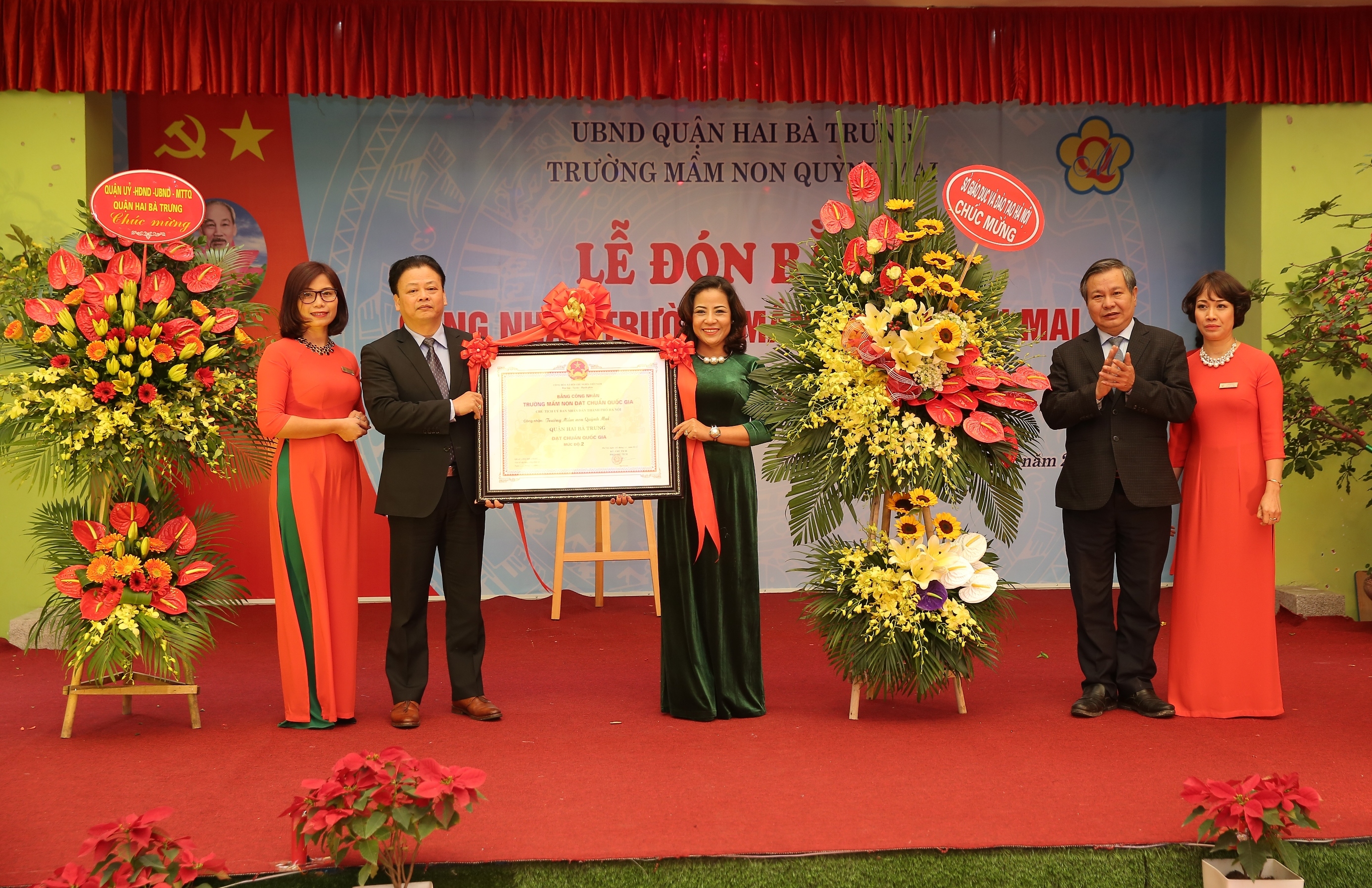 Lãnh đạo Sở GD&ĐT Hà Nội, quận Hai Bà Trưng trao Bằng chứng nhận CQG và tặng hoa nhà trường