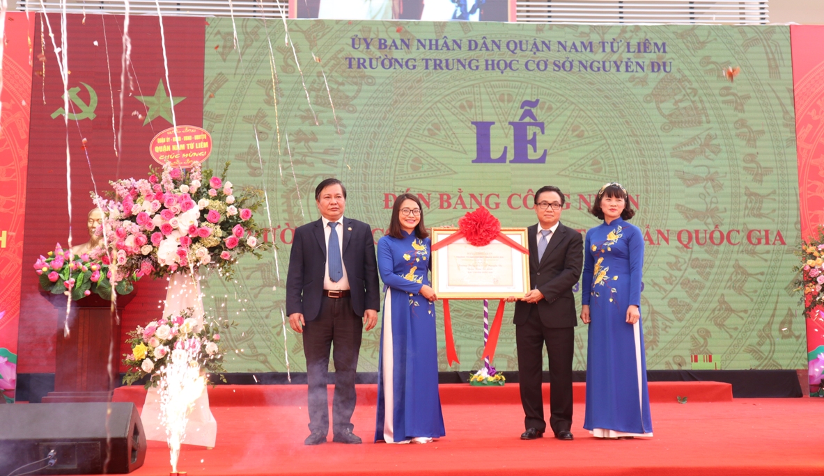 PGĐ Sở GD&ĐT Hà Nội Lê Ngọc Quang và Bí thư quận ủy Nam Từ Liêm Nguyễn Văn Hải trao Bằng công nhận trường chuẩn cho trường THCS Nguyễn Du