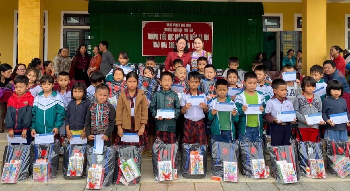 Tại đây, đoàn công tác của Trường Tiểu học Đoàn Thị Điểm Hà Nội đã trao tận tay các học sinh Trường Tiểu học Phú Tân những phần quà với tổng giá trị 170 triệu đồng gồm: balo, vở, đồ dùng học tập và trao tiền mặt cho 270 học sinh có hoàn cảnh khó khăn.