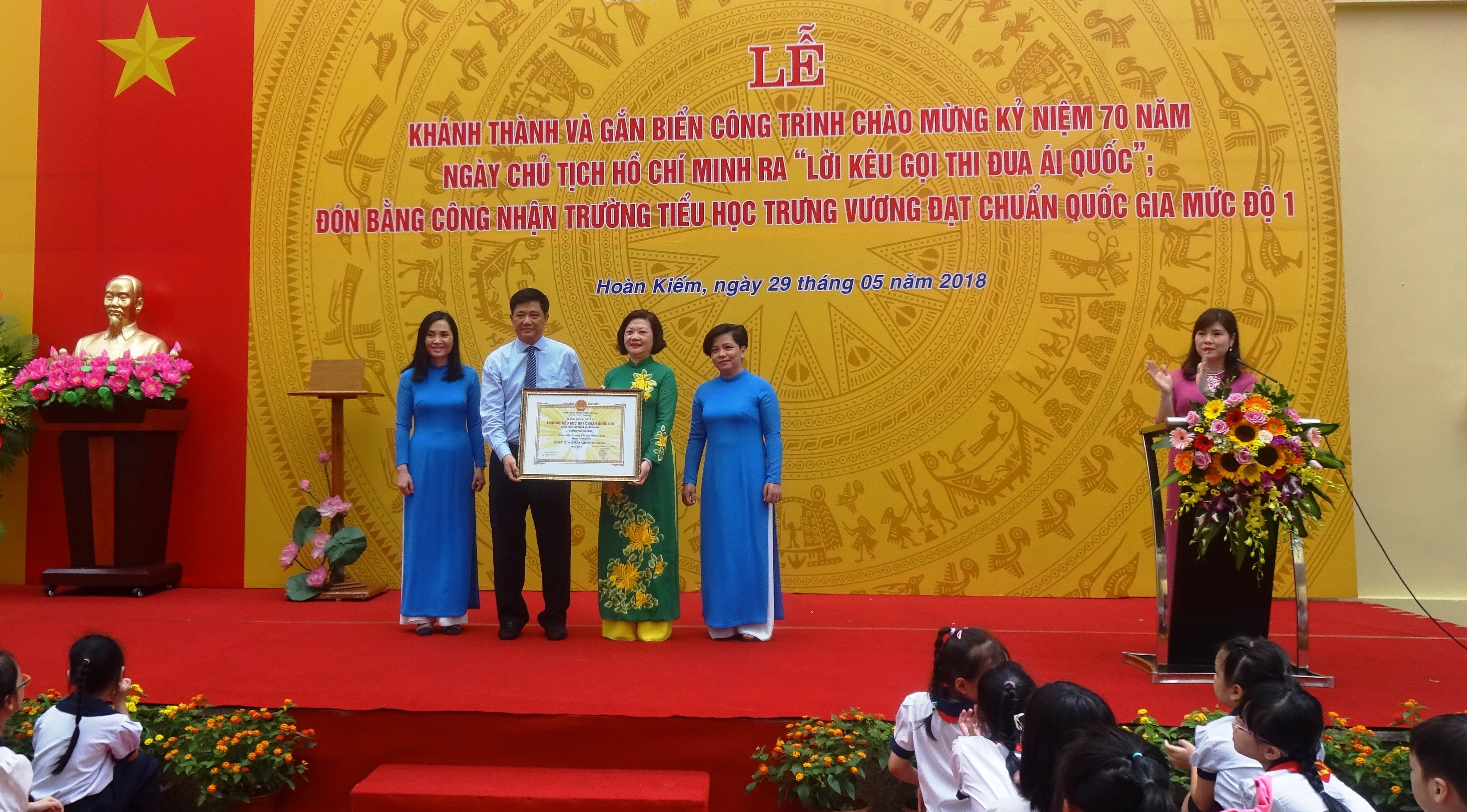 Tại buổi lễ, đại diện Sở Nội vụ đã công bố quyết định của UBND TP Hà Nội trao Bằng công nhận công trình chào mừng kỷ niệm 70 năm ngày Chủ tịch Hồ Chí Minh ra “Lời kêu gọi thi đua ái quốc” và Bằng công nhận đạt CQG mức độ 1 cho trường Tiểu học Trưng Vương.
