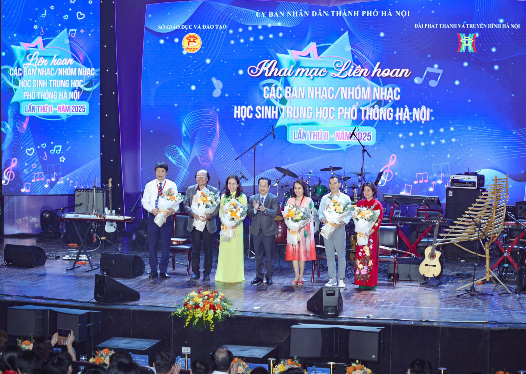 | Học sinh Hà Nội thể hiện tài năng với nhiều loại nhạc cụ âm nhạc khác nhau: Trống, ghita, đàn tranh... |