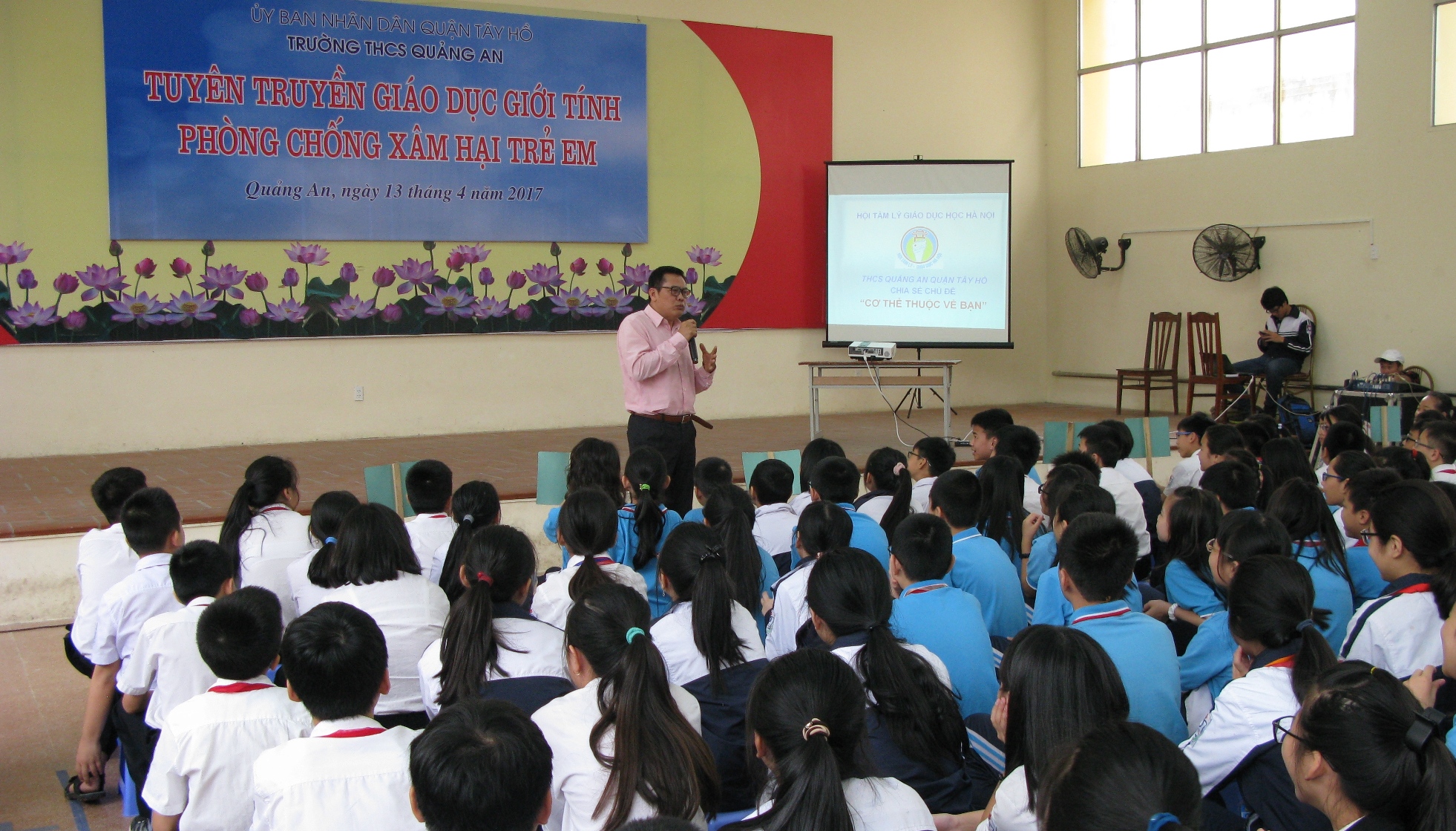 Hơn 600 học sinh nhà trường đã hào hứng, chăm chú lắng nghe chuyên gia Nguyễn Đình Sơn- Hội Tâm lý giáo dục học Hà Nội trao đổi về chương trình “Cơ thể thuộc về bạn”. Qua buổi tuyên truyền, các em nắm bắt được cụ thể hơn thực trạng và những nguyên nhân của bạo lực học đường, xâm hại trẻ em. Qua đó, các em học được những giải pháp tự làm chủ tình huống trong giao tiếp, hoạt động xã hội để tránh bị xâm hại và bạo lực…