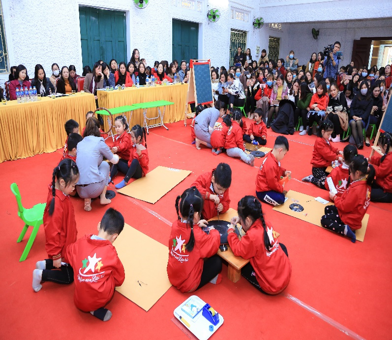 Tại Trường mầm non Liên Hà, đại biểu tham dự được kiến tập 02 hoạt động ứng dụng phương pháp giáo dục STEAM, thông qua các hoạt động trẻ được khám phá, trải nghiệm, thảo luận nhóm, thể hiện ý tưởng qua các hoạt động khám phá khoa học, thiết kế, chế tạo, toán, nghệ thuật …trẻ đoàn kết, hợp tác để cùng tạo ra sản phẩm như thiết kế.